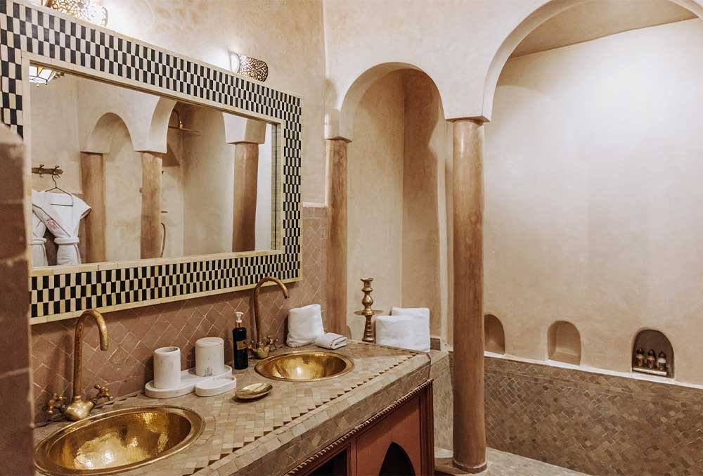 Located on the ground floor of the patio level of Riad Ksar Al Amal, the Fint suite has a surface area of 25 m2. It comprises a sleeping area and a sitting area. It also features a large, comfortable traditional hammam-style bathroom.