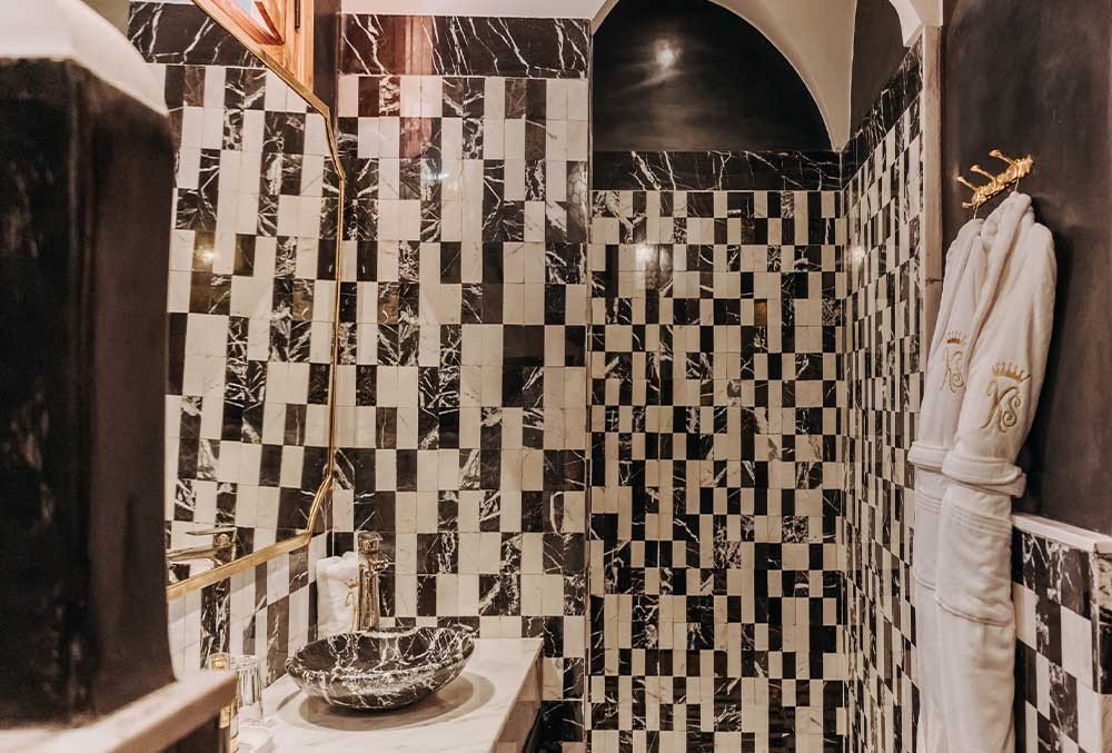 The bathroom plays with contrast, showcasing a blend of black and white marble, a natural stone basin, and elegant golden details. It invites you to experience a true wellness ritual—where modern comfort meets oriental inspiration.
