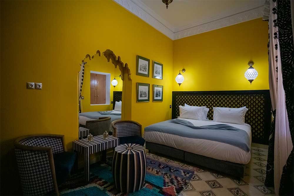 La chambre Dades, au Riad Ksar Al Amal Marrakech, bénéficie d'une véritable atmosphère enveloppante où vous pourrez vous détendre et vous ressourcer dans un cadre luxueux.
